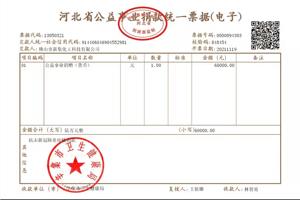 佛山市新集化工科技有限公司抗擊新冠肺炎疫情捐款